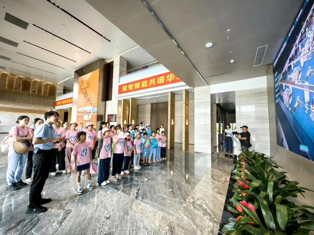 活动一开始,孩子们便迫不及待地踏入了六合联盟药业集团的大厅。3D数字化看板上的生动画面,让孩子们仿佛置身于一个充满科技与创新的现代制药工厂。他们瞪大眼睛,好奇地观察着每一条生产线、每一台设备,听着讲解员介绍六合联盟药业的儿药发展历程。